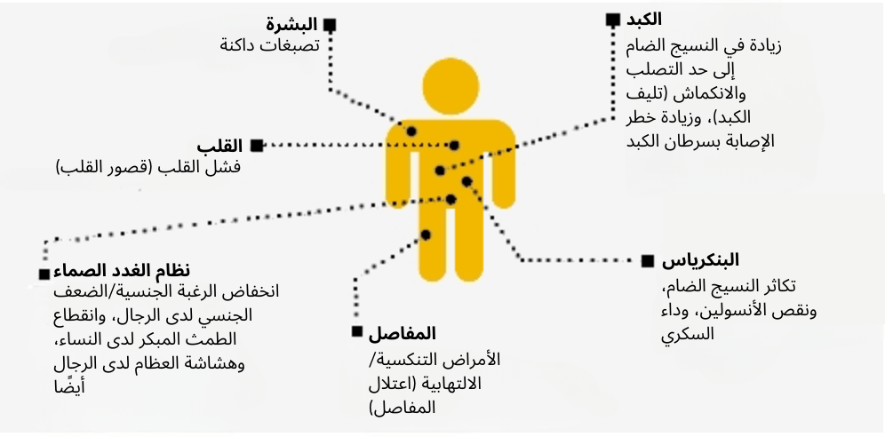تمتص كل كريات الدم الحمراء المركزة أكثر من 100 ضعف كمية الحديد التي يتم تناولها يومياً مع الطعام. ونظراً لأن جسم الإنسان لا يستطيع إفراز الحديد بشكل فعال، فإنه يترسب في أعضاء مختلفة، وخاصة الكبد والقلب والكلى ونخاع العظام (انظر الجدول 2) ويمكن أن يتلفها. يتعرض المرضى الذين يعانون من فقر الدم اللاتنسجي أو متلازمة خلل التنسج النقوي (MDS) لخطر زيادة الحديد حتى من دون نقل الدم، حيث أن ضعف وظيفة نخاع العظم يقلل من تكوين خلايا دم حمراء جديدة ولا يمكن استخدام الحديد بالكامل لتكوين خلايا دم حمراء جديدة.
