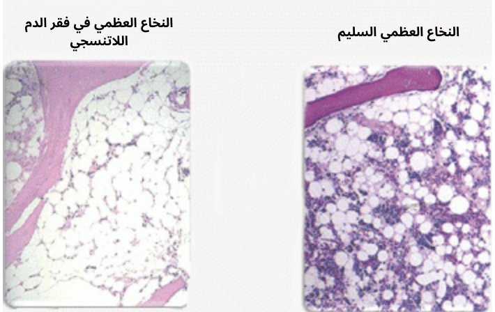 نتائج نخاع العظم لدى مريض مصاب بفقر الدم اللاتنسجي مقارنة بنخاع العظم السليم. يمكن تمييز النسيج الضام والخلايا الدهنية في النخاع العظمي المريض بشكل رئيسي. في النخاع السليم، تبرز خلايا الدم كنقاط صغيرة مختلفة الألوان عن الخلايا الدهنية البيضاء الكبيرة.