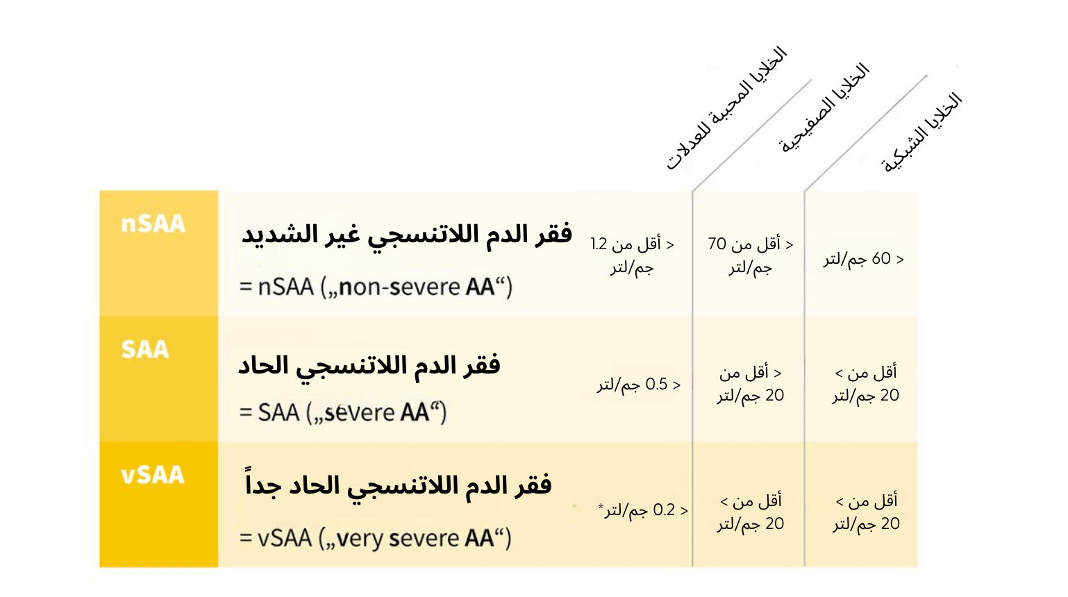 تصنيف فقر الدم اللاتنسجي بناءً على تعداد الدم (تعداد الخلايا والمسحة). يجب استيفاء معيارين من ثلاثة معايير. *للتصنيف على أنه فقر الدم اللاتنسجي، يجب استيفاء معيار الخلايا الحبيبية < 0.2 جم/لتر.