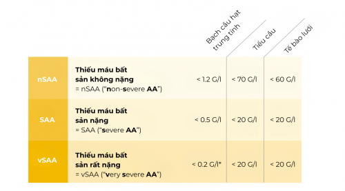 Phân loại thiếu máu bất sản dựa trên công thức máu (đếm tế bào và phết tế bào). Phải đáp ứng hai trong ba tiêu chí. *Để được phân loại là vSAA, tiêu chí bạch cầu hạt < 0,2 G/l phải được đáp ứng bắt buộc.