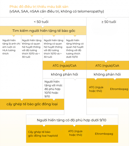 Quy trình điều trị cho bệnh nhân bị thiếu máu bất sản nặng và rất nặng được trình bày trong hình dưới đây.