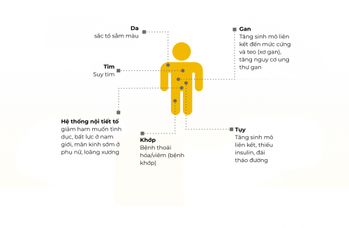 Với mỗi hồng cầu cô đặc, lượng sắt được hấp thụ gấp hơn 100 lần lượng sắt được cung cấp hàng ngày qua thức ăn. Do cơ thể con người không thể bài tiết sắt một cách chủ động, sắt sẽ được tích trữ trong các cơ quan khác nhau, chủ yếu là gan, tim, thận, tủy xương (xem bảng 2) và có thể gây tổn thương cho các cơ quan này. Bệnh nhân bị thiếu máu bất sản hoặc hội chứng rối loạn tạo máu (MDS) có nguy cơ bị quá tải sắt ngay cả khi không được truyền máu, vì chức năng tủy xương kém làm giảm sự hình thành hồng cầu mới và sắt không thể được sử dụng hoàn toàn để tạo ra các tế bào hồng cầu mới.